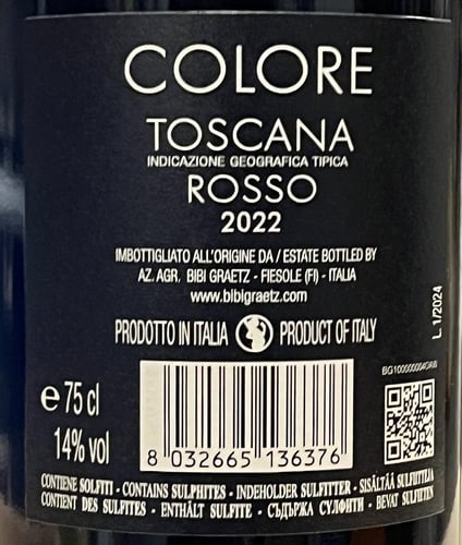 Colore 2021 er fremstillet på 100% Sangiovese, som Bibi Graetz selekterer fra 70, 80 og 90 år gamle Sangiovese-stokke fra Bibis fire bedste vinmarker i hhv. Lamole, Vincigliata, Olmo og Siena. For at sikre at hver enkelt drue selekteres ved optimal modenhed, høster Bibi hvert terroir ad op til 8 omgange (!)