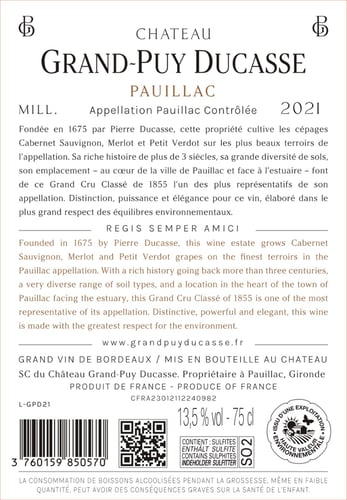 Grand-Puy Ducasse er i årgang 2021 fremstillet på 62% Cabernet Sauvignon og 38% Merlot, der høstes fra slottets topmarker i Pauillac. Slottet råder over 40 hektar vinmarker, der indeholder hele 11 forskellige typer jordbund og er således en fremragende repræsentant for det mangfoldige Pauillac-terroir. I kælderen bliver gæringen er fortaget i termostatstyret rustfriståltanke og herefter bliver vinen omstukket til franske egetræsfade, hvor den modner i 18-24 måneder. Der anvendes mellem 30-40 % ny eg i modningsprocessen.