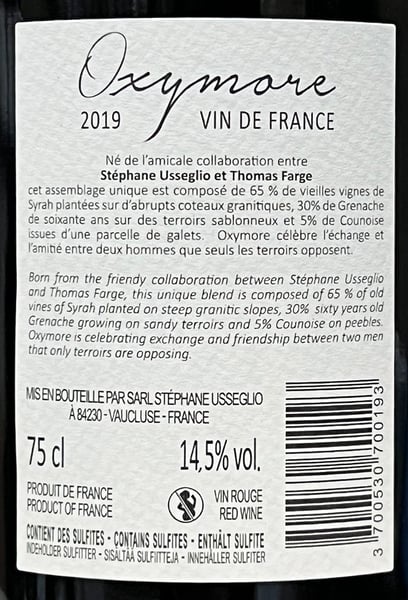 Oxymore 2019 er første årgang af et unikt samarbejde mellem Domaine Raymond Usseglio fra Châteauneuf-du-Pape og Domaine Guy Farge i Saint-Joseph. Kultproducenterne skaber deres fælles vin på topdruer fra mere end 60 år gamle vinstokke!