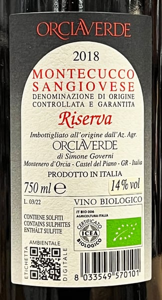 Orciaverde Montecucco Sangiovese Riserva DOCG 2018 ØKO