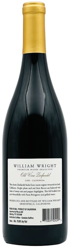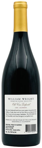 William Wrights Zinfandel er skabt på 100% Zinfandel fra samme type gamle "Old Vine"-buskvine, der har gjort det californiske distrikt Lodi berømt verden over. Vinen forkæles med 14 måneders lagring på franske og ungarske egetræsfade.