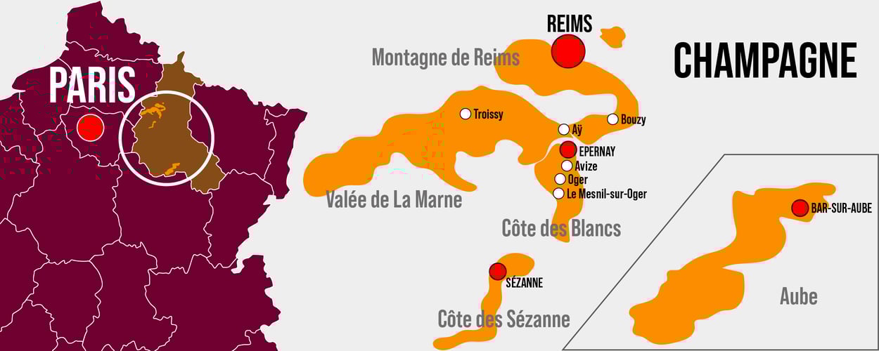 Champagne kommer udelukkende fra vinregionen Champagne AOC (Appellation d’origine contrôlée), der ligger omkring 120 km øst for Paris. Regionen er opdelt i sub-distrikter, hvor de mest kendte og betydningsfulde er Reims, Marne Valley, Côte des Blancs, Côtes des Bar, Côtes de Sézzane. Champagne skal aftappes inden for en radius af 100 km., for at det må kaldes Champagne. Al anden mousserende vin i Frankrig kaldes for Crémant.