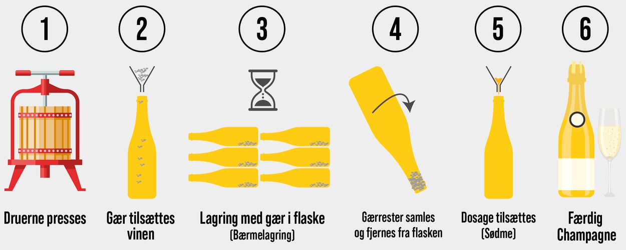 Den berømte Champagne-metode, ” Méthode champenoise”, må kun benævnes sådan i Champagne. Alle andre mousserende vine, hvor andengæringen har fundet sted på flaske, må i stedet bære betegnelsen ”Méthode traditionel”. Processen omkring fremstillingen af Champagne kan inddeles i 9 trin.