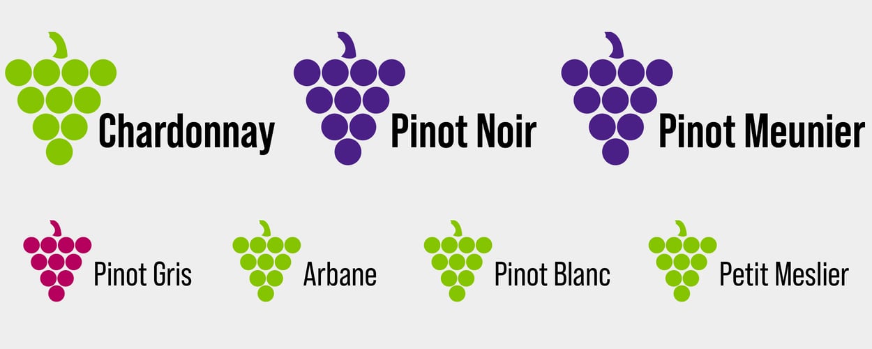 Der er i alt tilladt 7 forskellige druesorter i Champagne. 99 % af alle beplantninger udgøres af Pinot Noir, Chardonnay og Pinot Meunier. Derudover kan du også finde Pinot Gris, Pinot Blanc, Petit Meslier og Arbane, der alle er hvidvinsdruer. I Supervin sælger vi en Champagne, hvori der indgår 6 forskellige druesorter – ifølge ejeren er vinstokkene til den 7. lige ved at være klar, så de endelig kan lave en komplet Champagne med alle de tilladte druer. Du finder Champagnen her. Clos du Château de Bligny Champagne Cuvée 6 Cépages Brut Nature