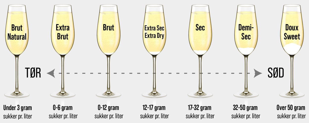 Champagne fremstilles i utal af varianter med forskellige sødmegrader. Der bruges en række betegnelser, som kan give dig en indikation af, hvor tør eller sød Champagnen er. Som du kan se nedenfor, vil vi kun anbefale dig at servere en demi-sec eller doux-Champagne, hvis vinen skal gå til kransekage eller desserter.