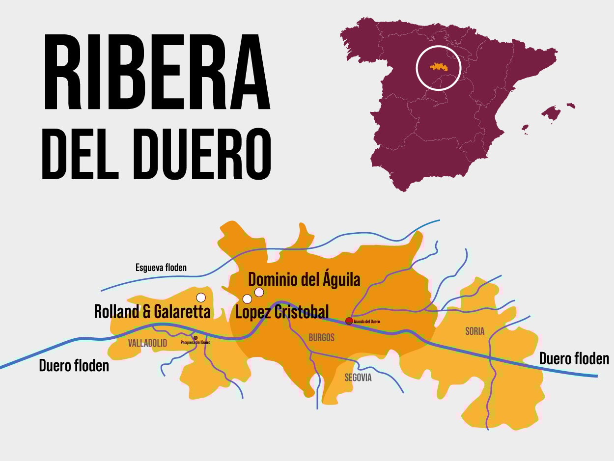 Ribera del Duero er en af Spaniens bedste vinområder og ligger godt et par timers kørsel nord for Madrid. Den berømte Douro-flod skærer igennem distriktet og løber hele vejen til Portugal, hvor den munder ud i Atlanterhavet.
