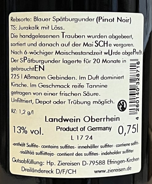 Hvordan er Weingut Ziereisen TS (Tschuppen) Blauer Spätburgunder 2022 fremstillet?
