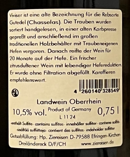 Viviser 2020 er fremstillet på 100% Gutedel (Chasselas), som Weingut Ziereisen håndhøster øverst oppe på den op til 50% stejle og kalkstenholdige topmark Efringer Oelberg i det sydlige Baden. Druerne presses ved relativt højt tryk, 6 bar, for at trække ekstra karakter og personlighed ud i mosten, der sidenhen spontangærer med terroirets naturligt forekommende gærstammer. Vinen modner hele næsten 2 år på 3000 liters tyske Assmann-egetræsfade i kontakt med de fine gærrester, der føjer elegant tekstur og Champagne-lignende kompleksitet til den friske hvidvin. Aftappet uden klaring og filtrering – samt med minimal tilsætning af sulfitter.